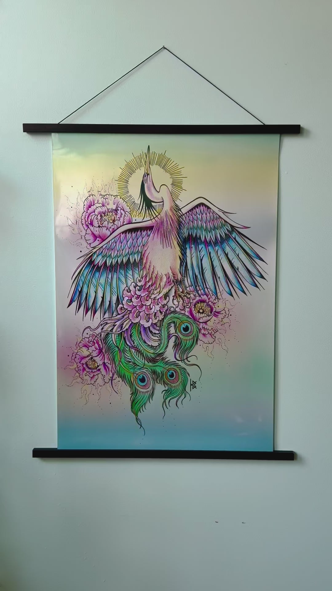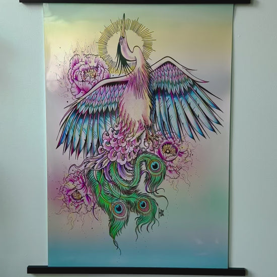 Printed on Fujicolor Crystal Archive Digital PEARL Paper with a glossy finish, the artwork glows with metallic warmth and pearlescent shimmer—echoing the moment the phoenix transcends flame and becomes light. The surface shifts with dimensionality and radiance, making it ideal for poster hangers, no frame needed.